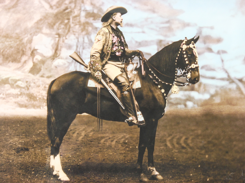 A hand colored photo mural from an early photograph depicting Buffalo Bill on horseback, photographer unknown.