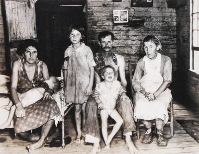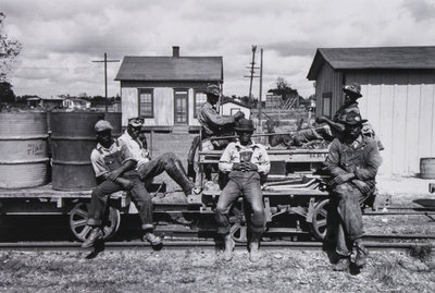 Comprising Sharecropper Bud Fields and his Family at Home, Hale County, Alabama, 1935, by Walker Evans, Railroad Workers, Port Barre, Louisiana, October, 1938 by Russell Lee, Ice for Sale, Harlinger, Texas, February, 1939 by Russell Lee and Mrs. Marcella Hart by John Delano; each matted, unframed.