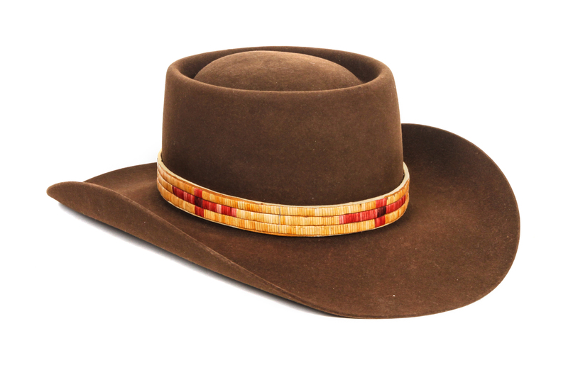 with quill hat band in shades of yellows and reds.