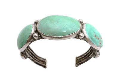 having three large light green stones and two smaller terminal stones on each end, on a four twisted wire shanks.