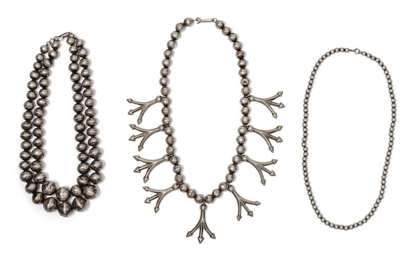 comprised of handmade beads and nine trident symbols stamped with the Navajo Guild Symbol, together with a double strand of bench made tooled beads and a single strand of beads.