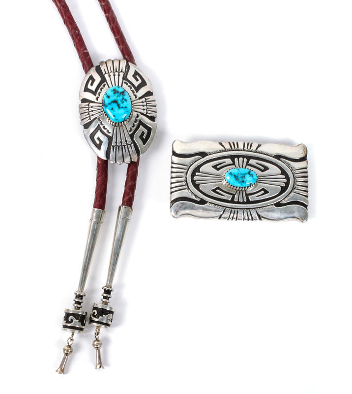 A Navajo Silver and Turquoise Belt Buckle and Matching Bolo, Thomas Singer