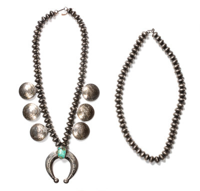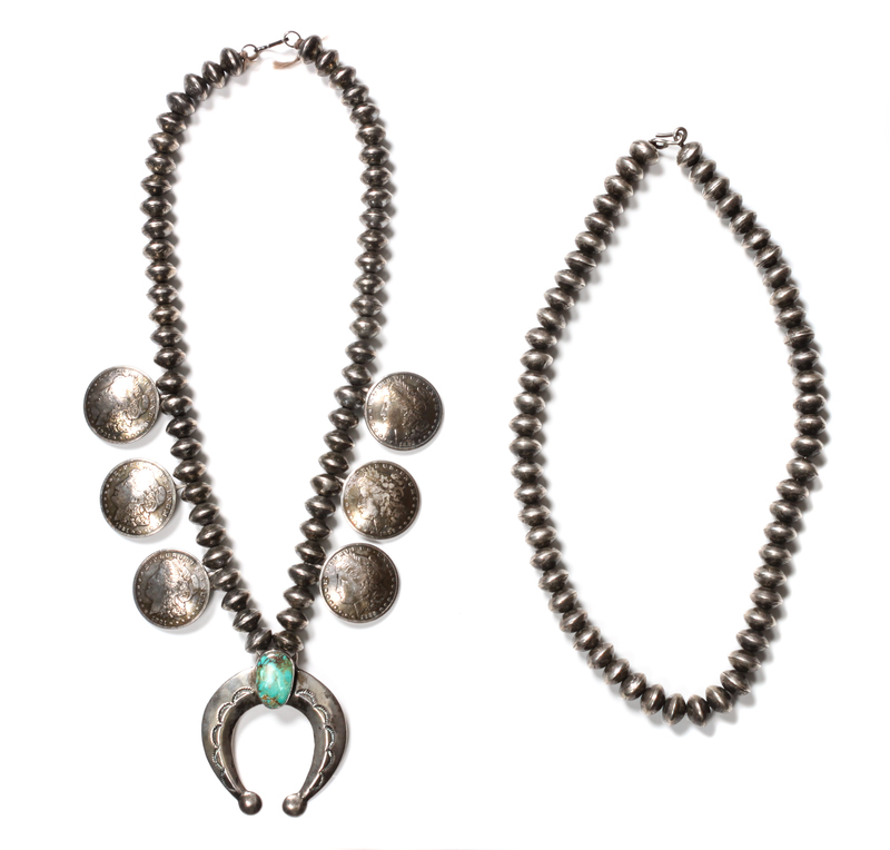 with six silver dollars dispersed between Mercury dime beads terminating in a cast naja set with a turquoise cabochon, together with another necklace made of Mercury dimes.