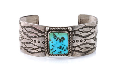 one central stone and stamped design, inscribed Navajo with mountain symbol.