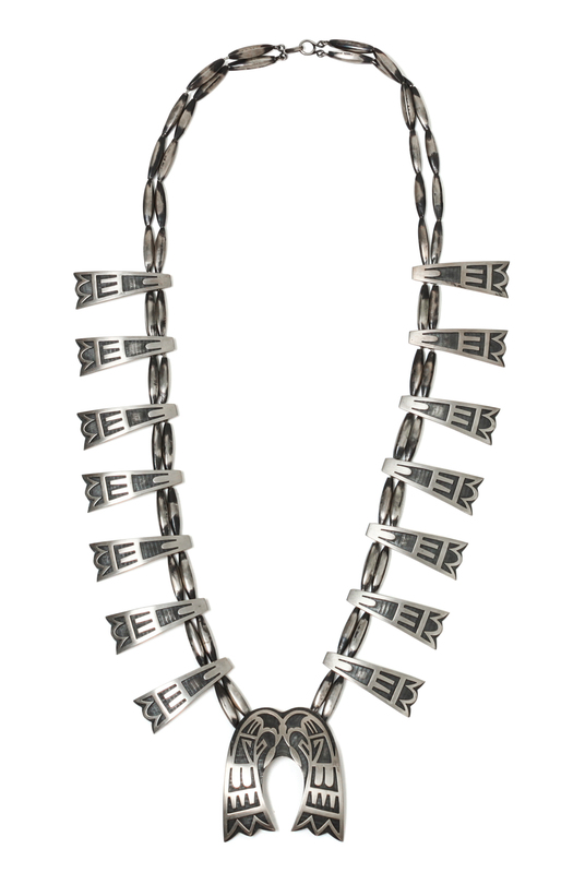 in the style of a squash blossom necklace, with overlay tabs, tubular beads and a central naja, signed with the symbol for Hopi Crafts.