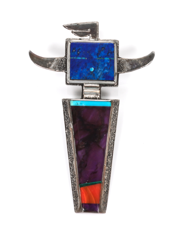 A Hopi Silver, Lapis, Sugilite, Coral and Turquoise Sand-Cast Horned Kachina Pendant, Michael Little Elk