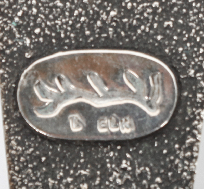 the head having square lapis stone decorated with stylized horns and feather ornament above a trapezoidal shaped body, set with various stones, signed with maker's mark and L. ELK.