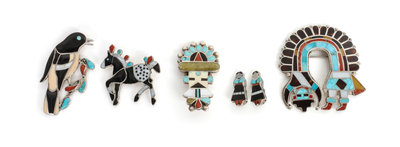 comprising four pins depicting a large Rainbow Man, a Kachina, a horse and a bird pin, each with a symbol for Nancy and Lee Eedake, and a pair of figural earrings.