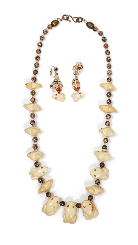 the first with numerous graduated frogs together with matching earrings, the necklace stamped Kaniatobe; the other with large trade beads and a single beaver fetish, typical of his style.