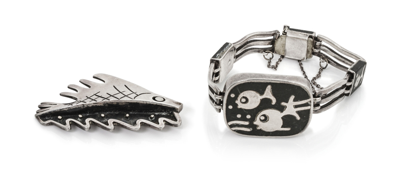 having central medallion depicting fish, stamped Los Castillo Taxco, together with a brooch of a stylized fish.