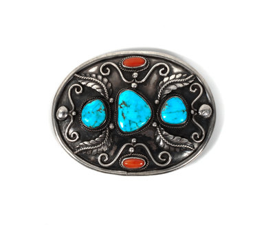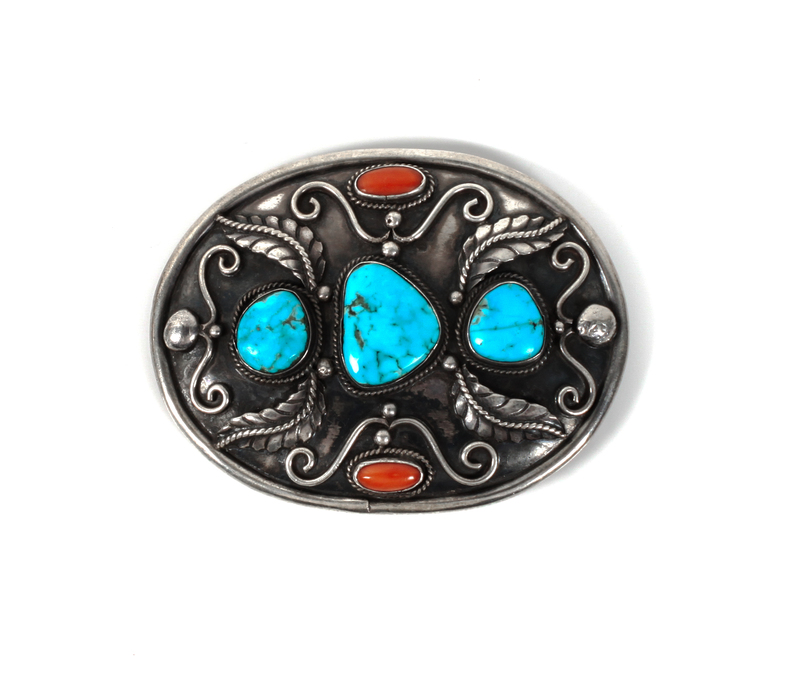 having three turquoise cabochon stones, two coral cabochons, applique leaves and wire design.