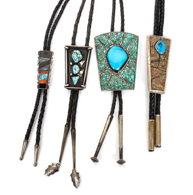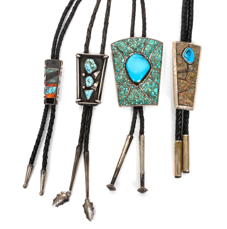 comprising an example having central turquoise cabochon surrounded by turquoise chip inlay, another with a turquoise cabochon surrounded by cobblestone opal, the third having inlay of turquoise, jet and spiney oyster, stamped A Francisco, and the final having three turquoise stones and stamped leaf tips, stamped R. Platero Handmade.