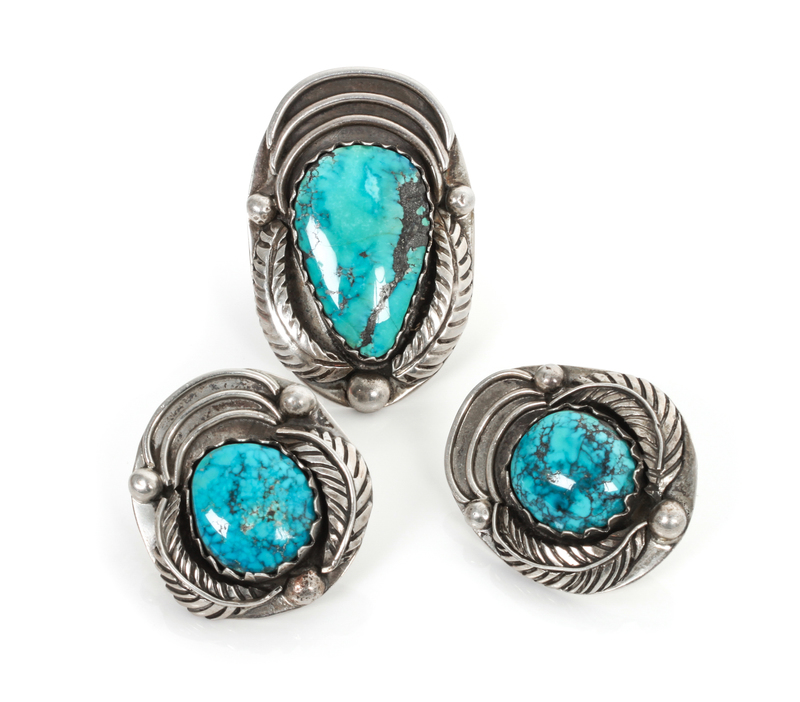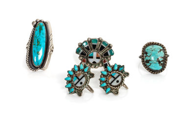including four rings with turquoise and silver settings and two pairs of earrings.