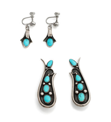 one with four turquoise cabochons set in a modernist shadow box setting, signed "Sterling Handmade by Carlos Diaz" (silversmith at Thunderbird Shop) and the other a pair of blossom style earrings.