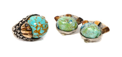 A Southwest Style Sterling and 14 Karat Yellow Gold Earclip and Ring Set