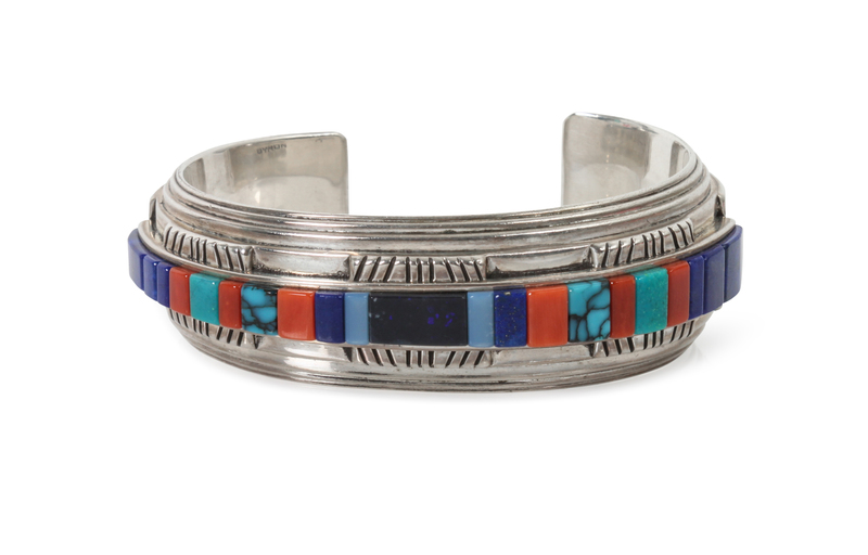 A Kiowa Silver, Lapis, Coral, Silica, and Turquoise Bracelet, Byron McCurtain
