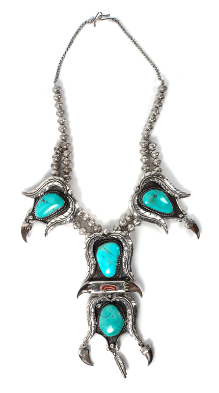 with large central pendant having two turquoise cabochons and a single branch piece of coral, flanked by foliate motif and bear claws, together with two additional pendants each with a single turquoise stone and bear claw.