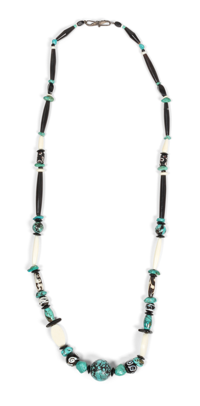 having various shaped beads in Chinese turquoise, jet and bone and clasp marked 925.