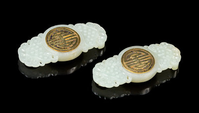 A Matched Pair of Chinese Gilt Metal Mounted Jade Court Buckles