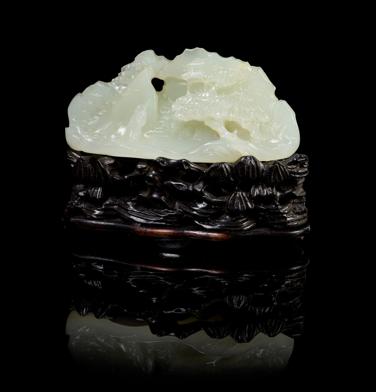 the horizontal mountain carved in relief on one side with an elder holding a staff beneath pine trees, the reverse carved with mountains and tree, carved to show rocks and water to the underside, raised on the original carved hardwood stand.
