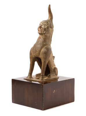 the body having a spiny back and hoofed feet and the head with a human face and a spire hat, showing traces of lacquer throughout, raised on a hardwood display base.