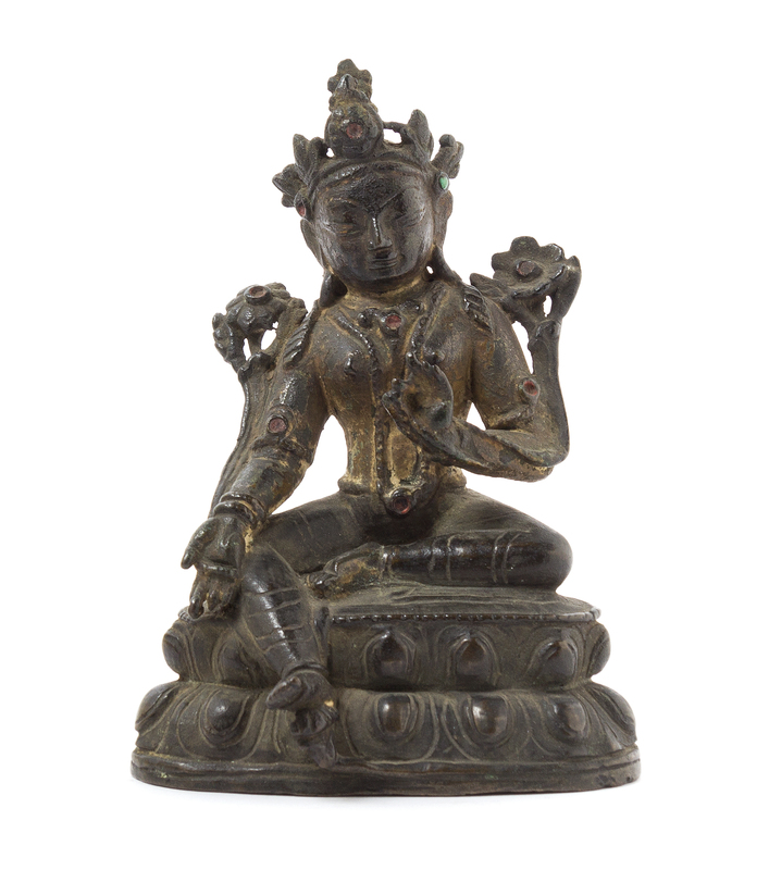 the figure seated on a double lotus base, the right hand in varadamudra and left hand raised in vitarkamudra, with traces of polychrome.
