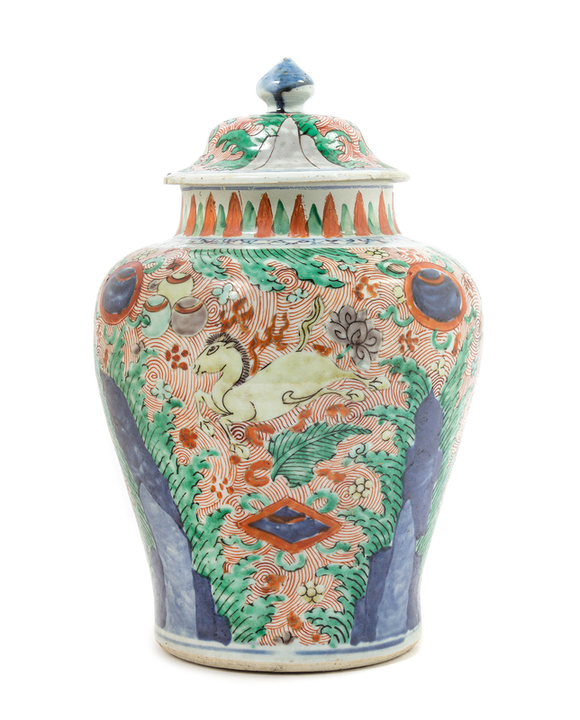 of robust baluster form, depicting galloping horses, scholars rocks, and other Buddhist emblems, the domed cover with lotus bud finial.