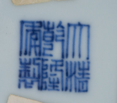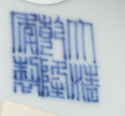 painted to show floral medallions amongst auspicious symbols within lappet borders, bearing a six-character Qianlong mark in underglaze blue and old collection labels to the underside.