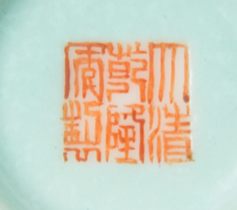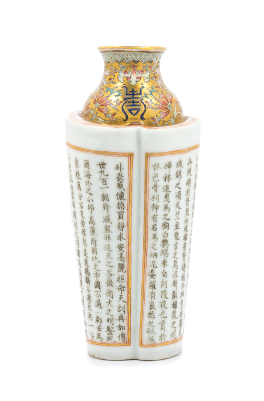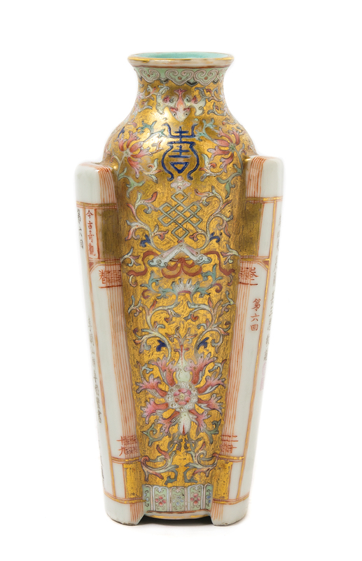 of meiping form, one side molded in the form a book with an inscription of the short story 'Li the Banished Immortal' Writes in Drunkenness to Impress the Barbarians from the Chinese classic Stories to Caution the World within gilt and red borders, the vase decorated with lotus scrolls, shou character, lingzhi and lappets on a gilt ground, bearing a six-character Qianlong mark in iron red on a turquoise ground.
