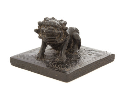 the fierce beast depicted growling with its large paws resting on a floral carved square base, bearing old collection labels to the underside.