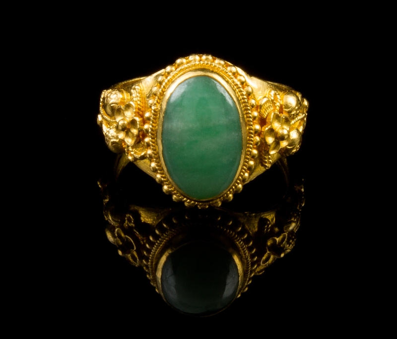 the oval emerald green cabochon set in a pure gold band carved with floral decoration, having two Chinese stamp marks.