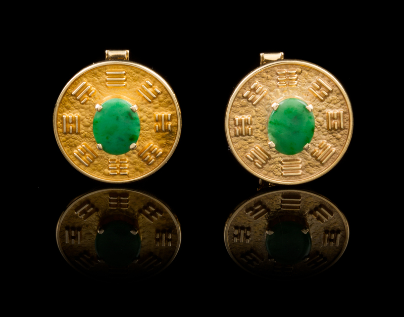 each having an oval emerald green plaque set in gold mounts carved with bagua characters.