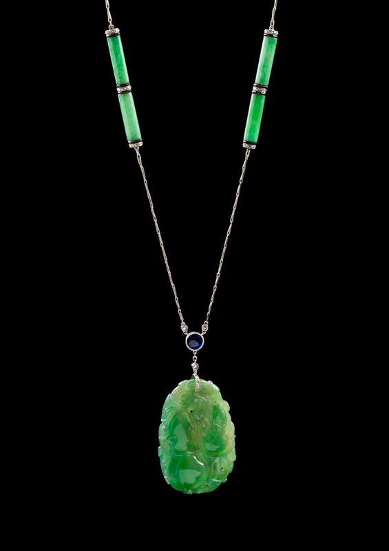 A Chinese Art Deco Jadeite, Platinum, Sapphire and Diamond Necklace