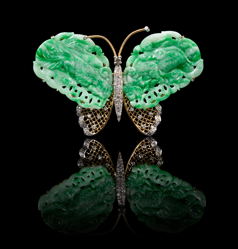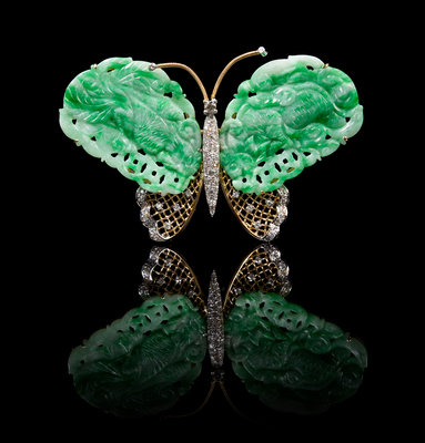A Chinese Jadeite, 14 Karat Gold and Diamond Butterfly Brooch