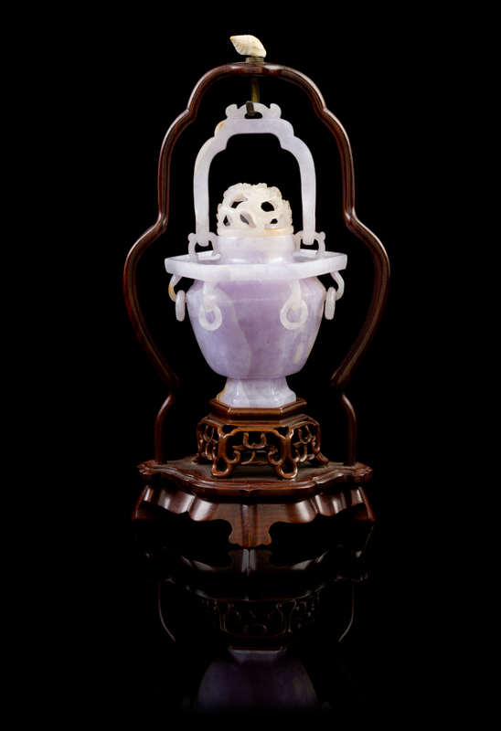 of hexagonal form, the lift-off cover openworked to show flower blossoms, the vase supporting loose ring handles to each corner, set within a carved hardwood stand.