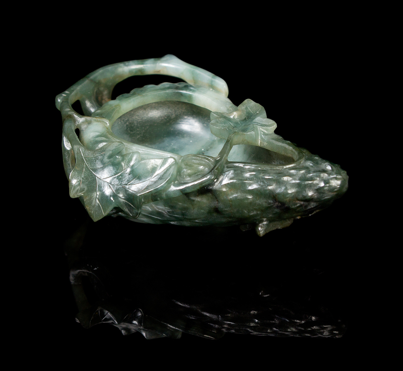 of mottled dark green and white stone, in the form of a lychee with openworked foliate branch.