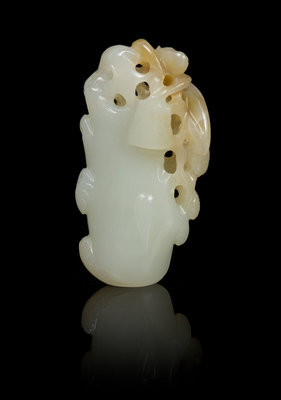 of a pale celadon stone with russet inclusion, depicting a monkey climbing on pine branches and tree trunk.
