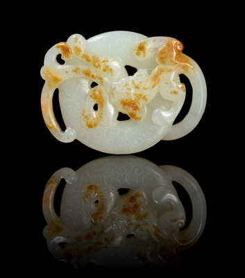 having russet skin, worked in relief to show a sinuous chilong intertwined with a C-scroll incised bi disc.