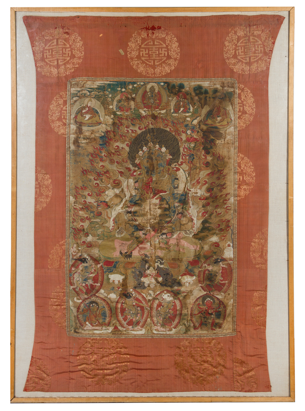 the central bodhisattva figure seated in lalitasana with a ferocious expression on his face, wearing flowing celestial scarves and a tiara of skulls, the naked body adorned with jewelry, backed by a flaming mandala and surrounded by various llama figures to the upper register with other standing wrathful deities to the lower part, the thangka set on a light orange brocade with roundels enclosing shou characters and clusters of clouds.