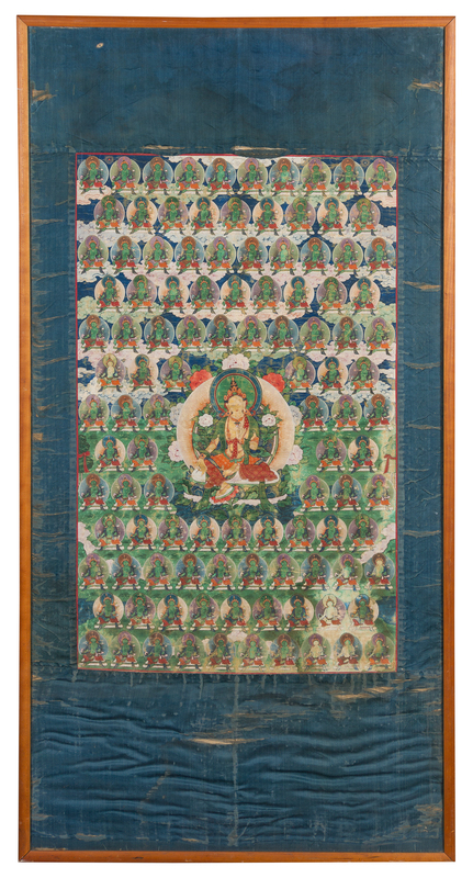 the White Tara depicted in the center seated in lalitasana on a single lotus plinth, the left hand raised to the chest while the right hand lowered in varadamudra, wearing a dhoti and a peaked crown, the body adorned with jewelry, surrounded by numerous seated Green Tara figures.