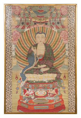 depicting a central Buddha figure seated in dhyanasana on a double lotus base raised on a stepped pedestal applied with beast mask decoration and two guardians resting atop, the Buddha's face with a benevolent expression, his right hand in vitarka mudra and the left hand resting at front, wearing elaborate robes and all hair in tight knots, backed by a radiating mandala, all below a canopy and set in a background filled with auspicious clouds. Framed.