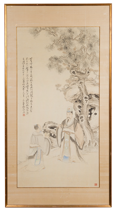 depicting two scholars having a conversation under pine tree besides rockwork, having calligraphic inscription to the left, signed possibly Zhang Ben(Da)bao, dated Xianfeng yuan nian (the first year of Xianfeng's reign, corresponding to year 1850), ink and color on paper, framed. The reverse bearing Gump's San Francisco label.