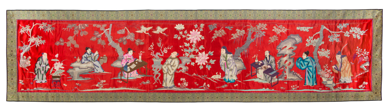 worked to show eight scholars, each engaged in various activities, all on a red ground within brocade borders.
