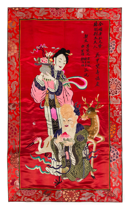 worked to depict the immortal Shoulao bearing a peach in both hands, the female immortal Magu standing next to him with her hands holding a flower-filled basket, a deer and a crane standing beside the two immortals, having inscriptions meaning "Presented to Quan Shun and his wife from five best friends to celebrate the couple's sixtieth birthday and their longevity," with a floral border, all against a red ground.