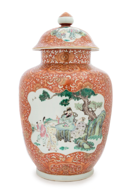 of ovoid form with domed lift-off cover and lotus bud finial, the jar and cover with eight shaped panels, four depicting scholars and attendants in a landscape, two depicting auspicious symbols and two depicting fishermen in a mountainous landscape, all on an iron red lotus scroll ground interspersed with auspicious symbols, the base bearing a six-character Qianlong mark in iron red.
