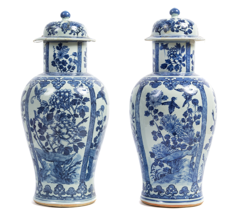 A Pair of Chinese Export Blue and White Porcelain Covered Vases