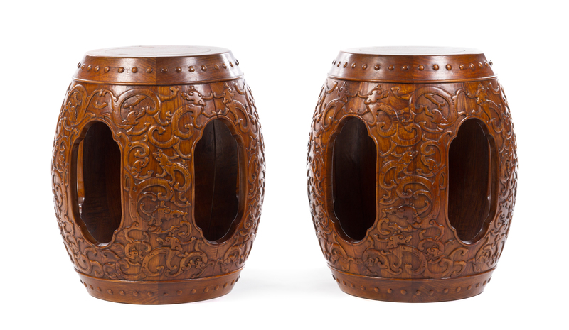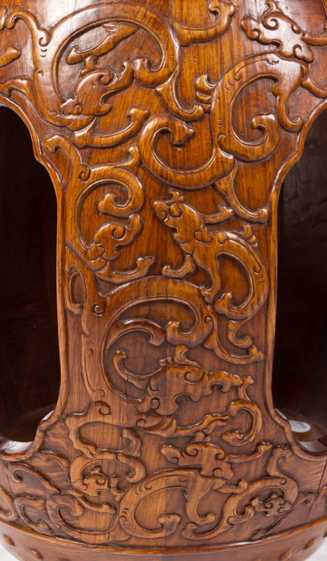 each of open barrel form, each carved in relief to show archaistic chilong, between bands of raised bosses.