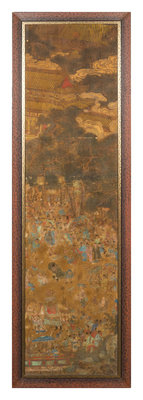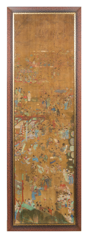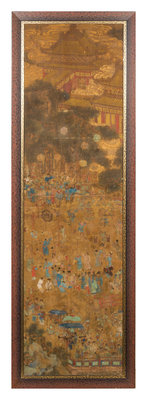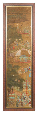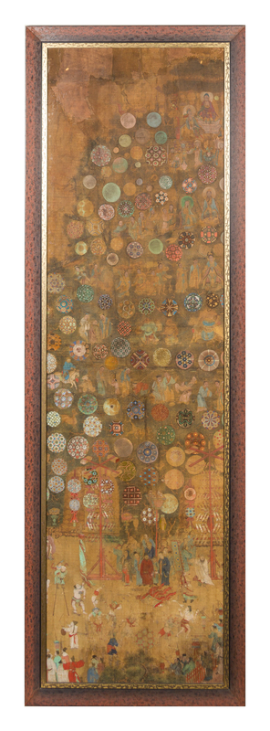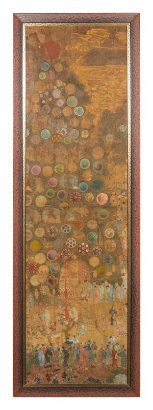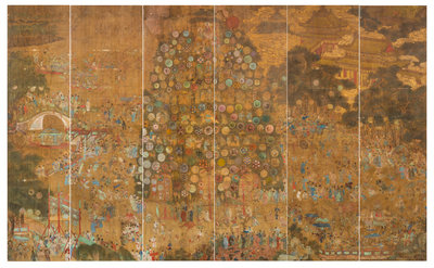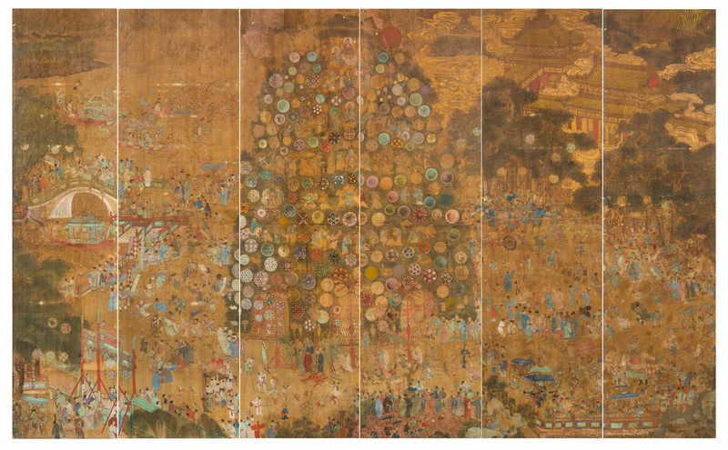 the Buddhist Lantern Festival, or Yuan Xiao Festival, the panels painted in continuation to show hundreds of figures, including immortals, deities, civil and court officials, villagers, soldiers and children, acrobats and musicians engaged in celebration, the pine trees adorned with over 150 colorful lanterns and the Buddha seated on a lotus plinth at the top of the central pine tree, a Buddhist temple engulfed in fog and dragon boats appear in the top corners.