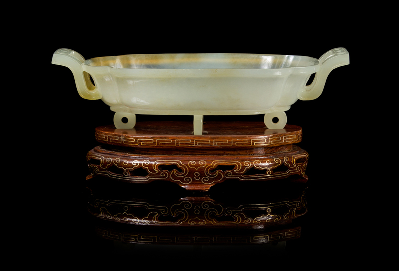 of a pale celadon stone, the lobed dish with square handles decorated with raised bosses above ring feet, raised on a silver inlaid hardwood stand.