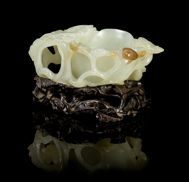 of a pale celadon stone with russet inclusions, the reservoir worked in the form of a prunus blossom adorned with various floral blossoms and buds, having openworked handle, raised on a similarly decorated hardwood stand.